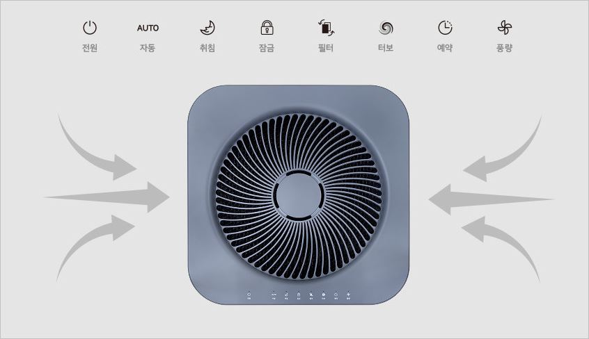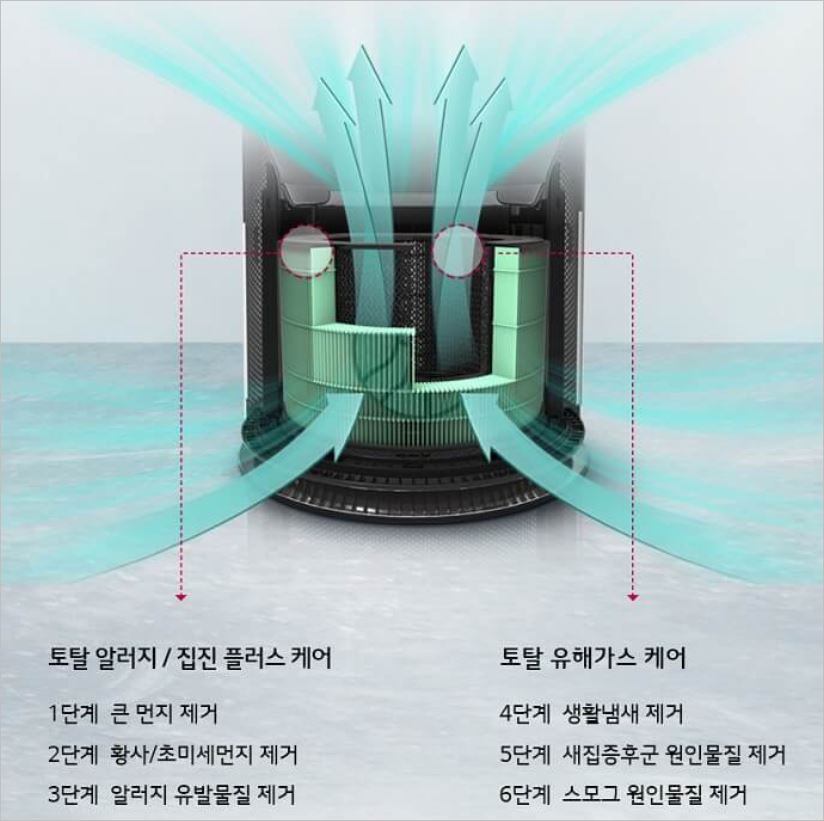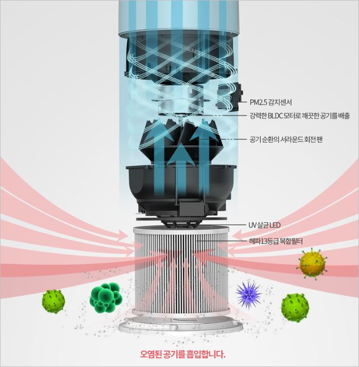 360도 유연하게 회전을 하기 때문에 사각지대가 없이 꼼꼼하게 청정이 가능하며, 부스터 기능을 내장하고 있어서 멀리까지고 청정할 수 있습니다. 또한 토탈케어 시스템으로 각종 유해물질을 맞춤형으로 청정합니다.