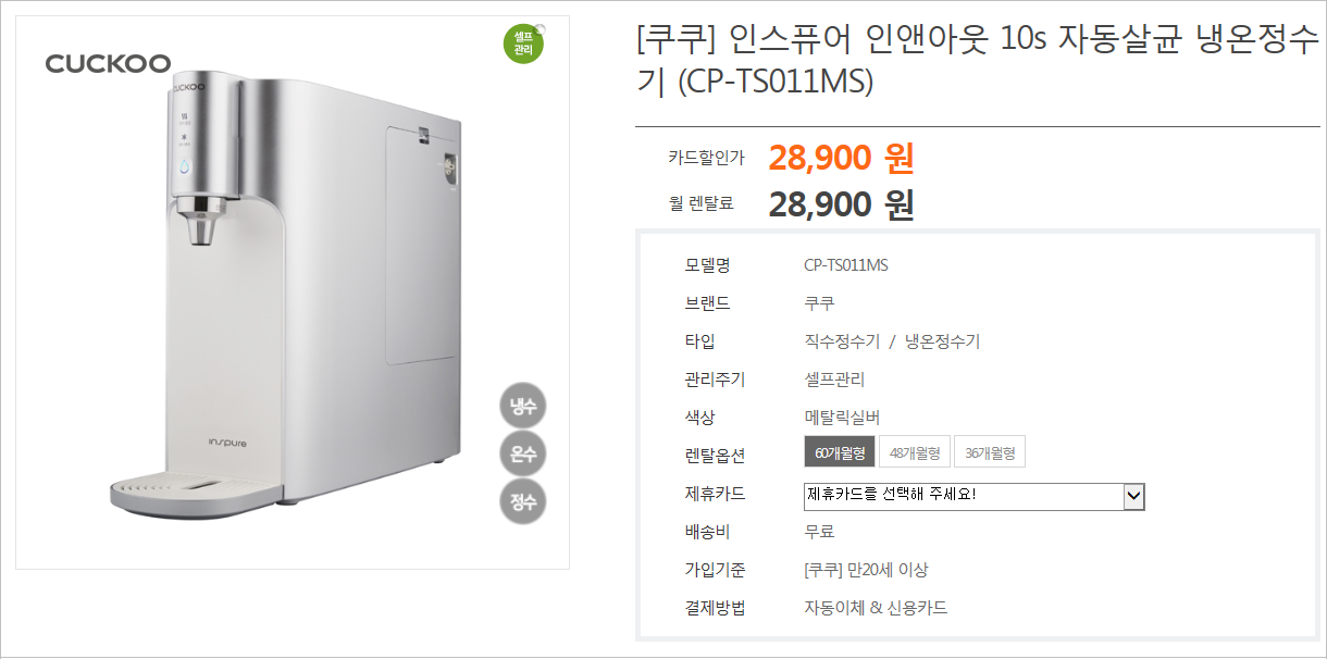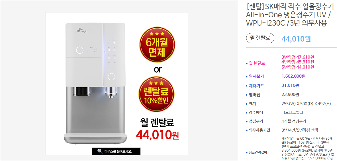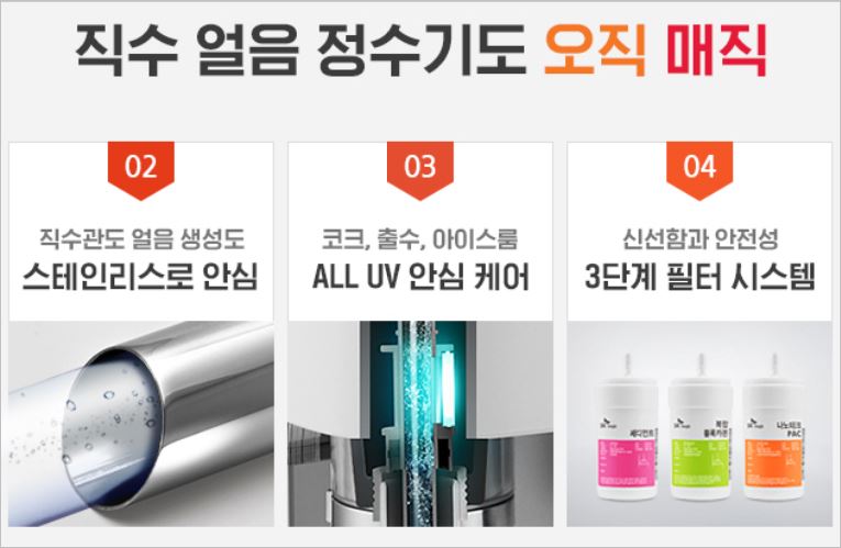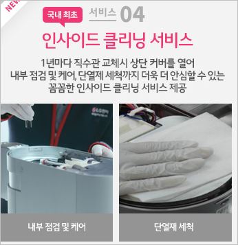 정수된 물에 무엇보다 신경쓰는 브랜드로 아이가 있는 집에 특히 인기가 많은 제품입니다. ALL UV안심케어를 활용하여 보다 더 깨끗한 물을 마실 수 있습니다. 통신사가 SK라면 추가 할인을 받을 수 있다고 하네요.