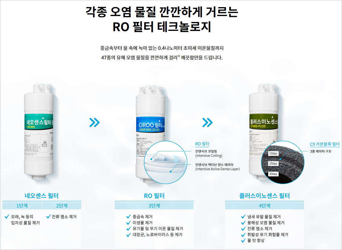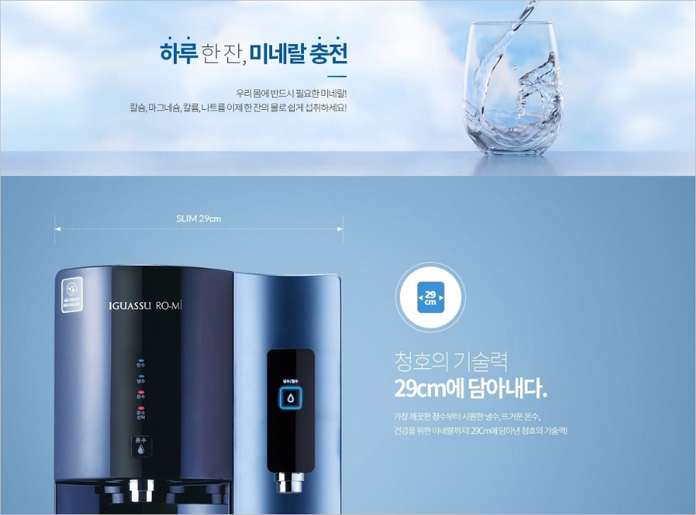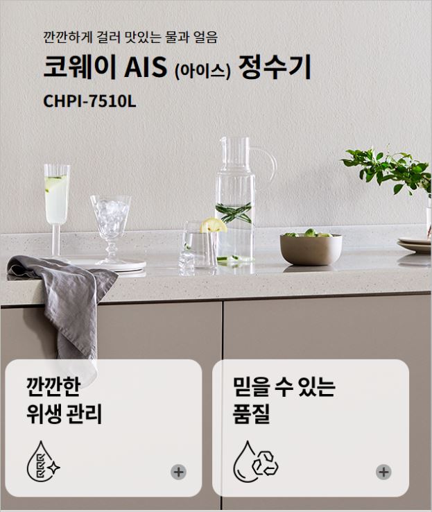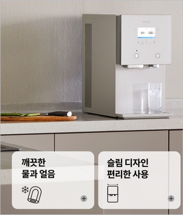 디자인적으로도 매우 고급스러운 느낌이 나서 인테리어용으로도 좋으며, 코웨이에서 개발한 필터를 사용, 물에 대한 자부심을 갖고 있는 브랜드입니다.