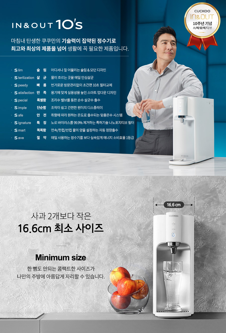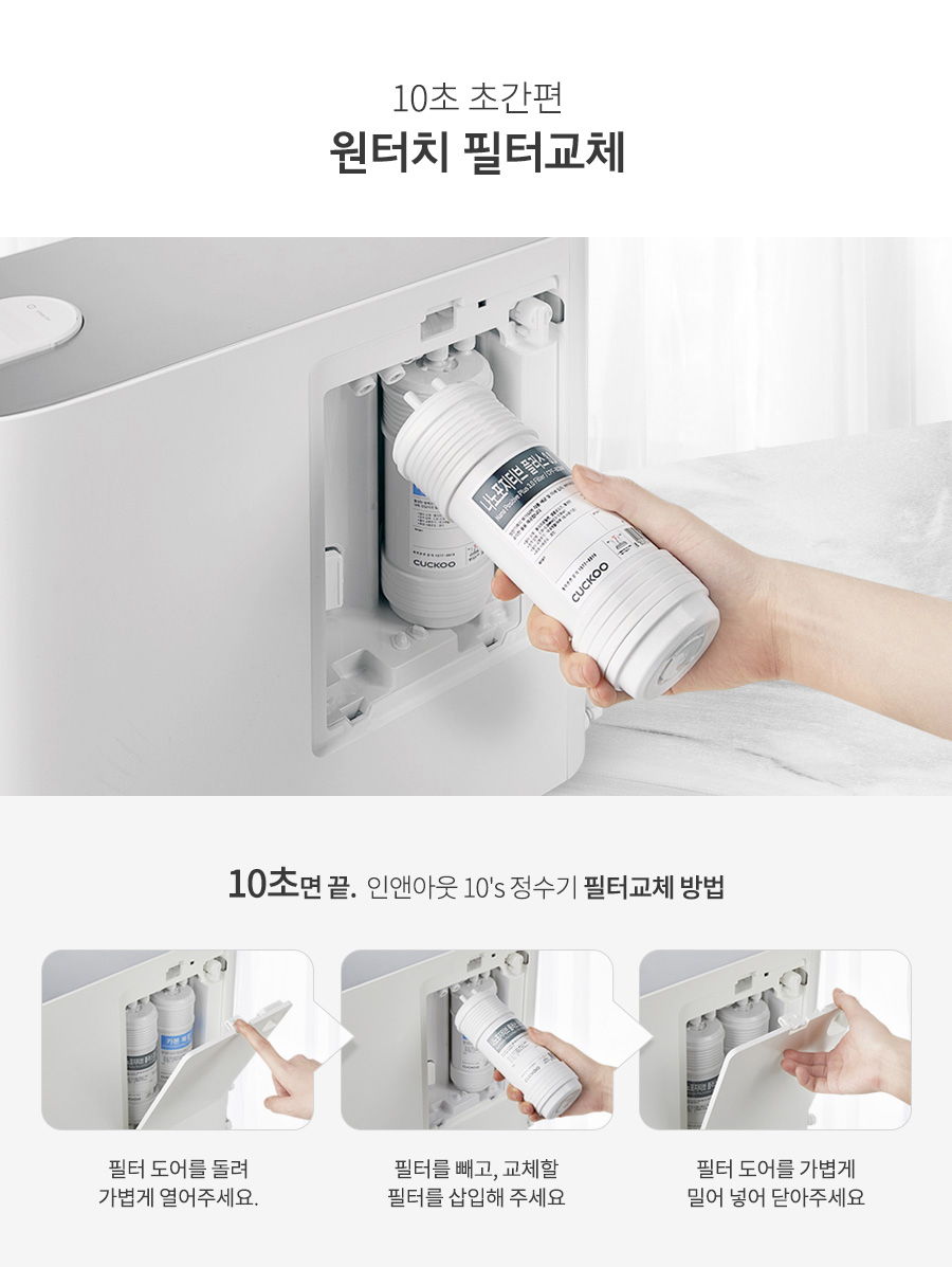 쿠쿠는 소비자의 편의성에 특히 신경을 쓴 정수기 브랜드입니다. 정수기 바닥에 물이 튀는 것을 방지하는 무빙코크부터, 자동살균, 원터치 필터교환 등 부분부분 편리한 기능을 갖추고 있습니다.