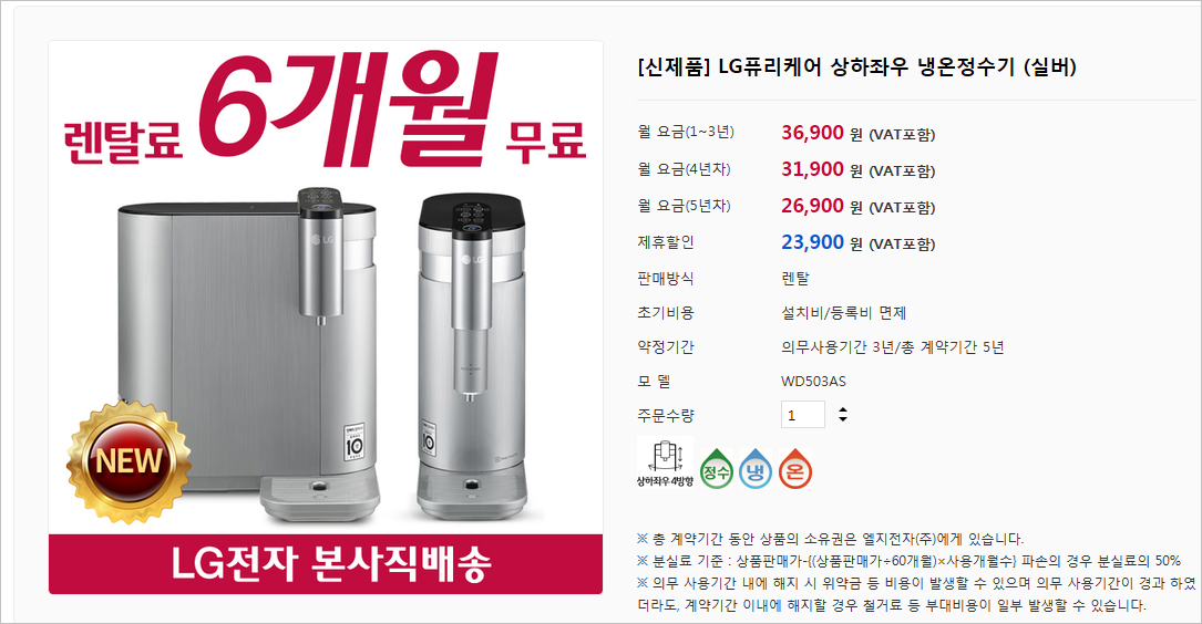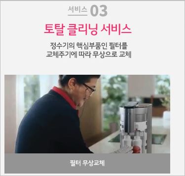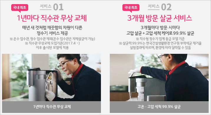 LG퓨리케어는 소비자 만족도가 매우 높아 재렌탈 충성고객이 많은 제품입니다. 특히 3개월 단위로 방문하여 정수기를 청소해주기 때문에 위생상 믿음이 가며, 매년 직수관을 무상으로 교체해주는 특장점이 있습니다.