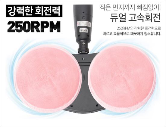 LG리튬이온 배터리를 사용하여 FULL충전 시 3시간30분을 사용할 수 있으며, 좁은 곳도 부드럽고 가볍게 청소할 수 있습니다. RPM이 자그마치 250이나 되기 때문에 묵은 먼지도 거침없이 청소합니다. 힘이 쌘 물걸레청소기