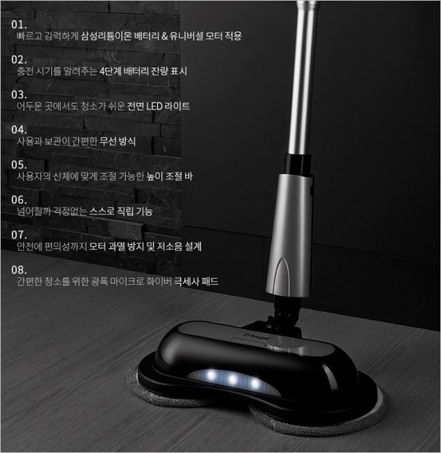 손목 쏠림현상이나 흔들림을 잡아주기 때문에 손목에 무리가 가지 않으며, 전용걸레를 물에 적셔서 가볍게 붙여주기만 하면 됩니다. 가격은 11만원부터 입니다.