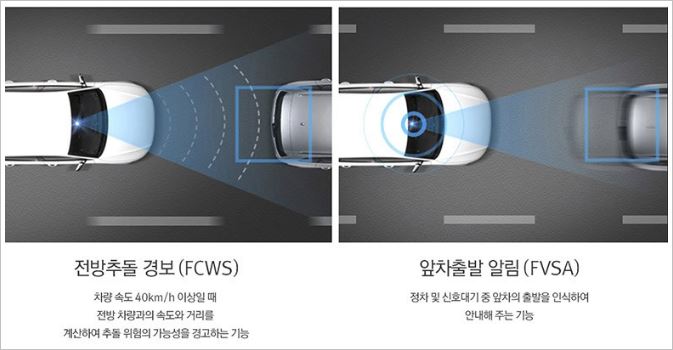전방추돌 경보와 앞차출발 알림 기능을 가지고 있어서 운전의 안전함을 한층 높여줍니다. 특히 전방추돌 경보의 경우는 속도가 40km/h 이상일 때 속도와 거리를 자동으로 체킹하여 경고합니다.