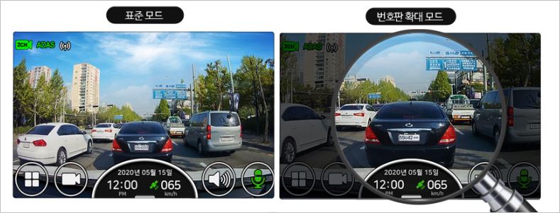 또한 번호판을 확대할 수 있어서 주차뺑소니 피해를 보았을 때도 문제없이 확인이 가능합니다. 배터리 안심보호 기능이 있어 상시촬영도 걱정없이 켜놓을 수 있습니다.
