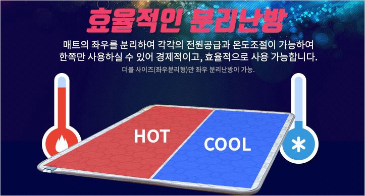 좌우 분리형 난방으로 2인이 사용할 시 각자 온도조절이 가능합니다. 더불어 BLDC 모터를 적용하여 온수매트 시 발생하는 소음을 최저로 줄였습니다.