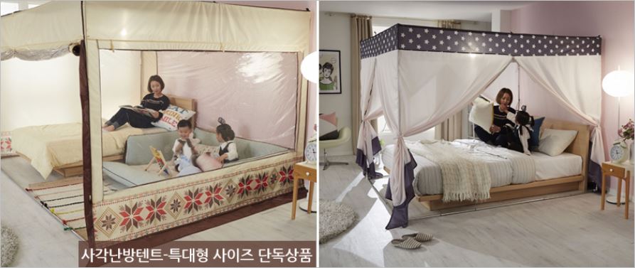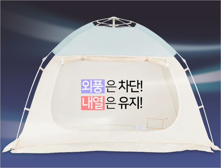 자립형 스텐봉을 가지고 있어서 벽면설치나 구멍을 뚫을 필요가 없으며, 끈으로 고정하기에 뒤틀림도 전혀 없습니다. 충분한 수납주머니와 외풍차단 스커트로 난방텐트의 효율을 높였습니다. 가격은 9만원대 부터 입니다.