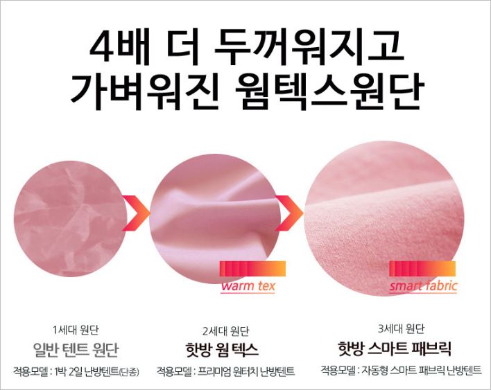 2020년형은 원단을 4배 더 두껍게하여 보온성을 높였으며, 훨씬 가벼워진 웜텍스 원단을 사용하여 효율을 높였습니다. 난방텐트 효과의 90%는 원단 차이라 할 수 있는데, 이점에서 높은 만족도를 받은 제품이라 할 수 있습니다.