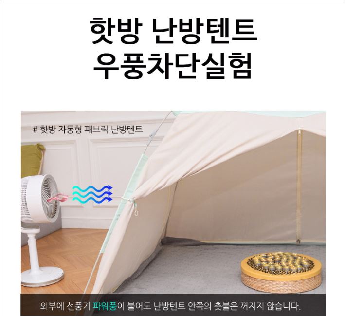 외풍 실험에서도 완벽하게 통과를 하였으며, 장시간 사용에도 원단이 헤지거나 변색되는 것을 최소화하였습니다. 가격은 3만원 내외입니다. 원터치 난방텐트 추천