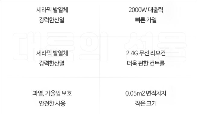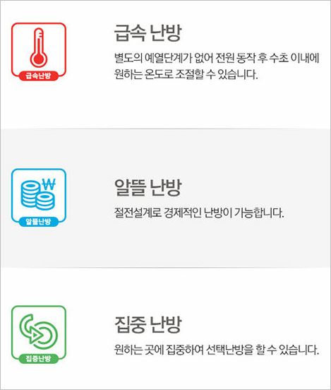 PTC난방시스템을 적용하여 전기요금은 줄이고 고효율을 발휘할 수 있으며, 하단에 바퀴가 달려있어 이동이 매우 편리합니다. 또한 난방을 선택/집중을 골라 상황에 맞게 효과적으로 할 수 있는 부분도 매력적입니다.