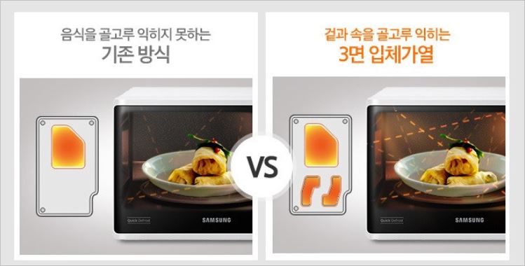 삼성 전자레인지 MS23K3535AW는3면을 입체적으로 가열해주어 음식의 겉과 속을 모두 맛있게 익혀줍니다. 또한 해동부터 요리까지 각종 기능들이 탑재되어 있어 매력적입니다.