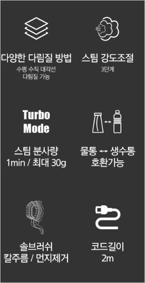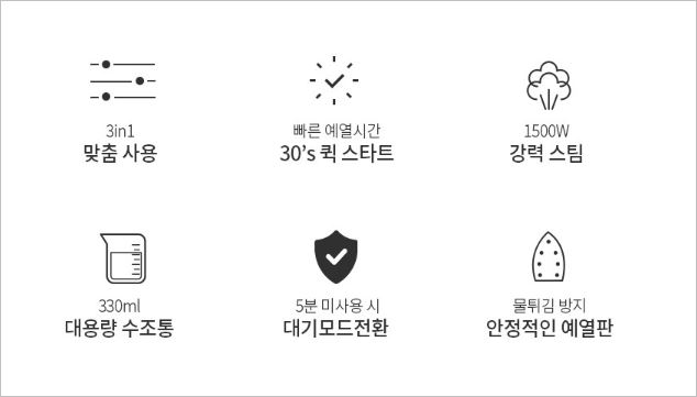 30초 퀵스타트로 예열타이밍을 최대한 단축시켰으며, 1500W의 강력한 파워를 자랑합니다. 건식모드와 습식모드 2가지 기능을 나눠놔서 옷의 종류에 따라 맞춰서 다림질을 할 수 있습니다.