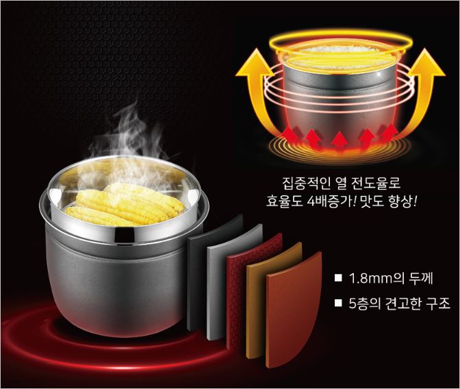 초고압력을 사용하여 보도 쫀득하고 찰진 밥맛을 구현해낼 수 있으며, 딱딱한 곡물도 보다 맛있게 만들어 냅니다. 내솥 역시 스테인레스로 제작되어 본연의 맛을 느낄 수 있습니다.