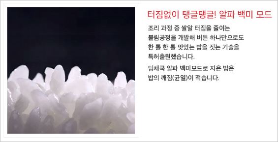 위니아 딤채쿡은 나노알파히팅 시스템을 적용하여, 열을 보다 골고루 전달합니다. 이에 따라 쫀득하고, 매우 찰진 밥을 만들어 냅니다.