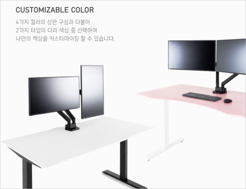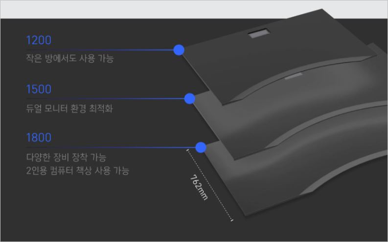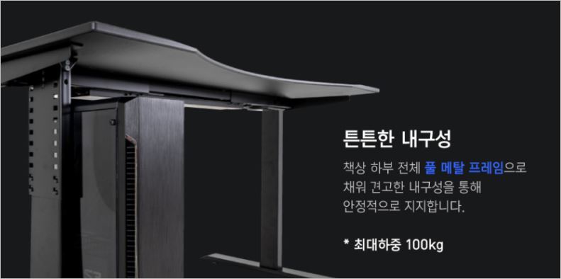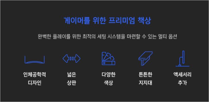 인체공학적인 디자인과 넓은 상판, 튼튼한 지지대를 가지고 있어 컴퓨터를 하는데 최적의 환경을 제공하며, 다양한 악세사리로 편의성을 극대화하였습니다.