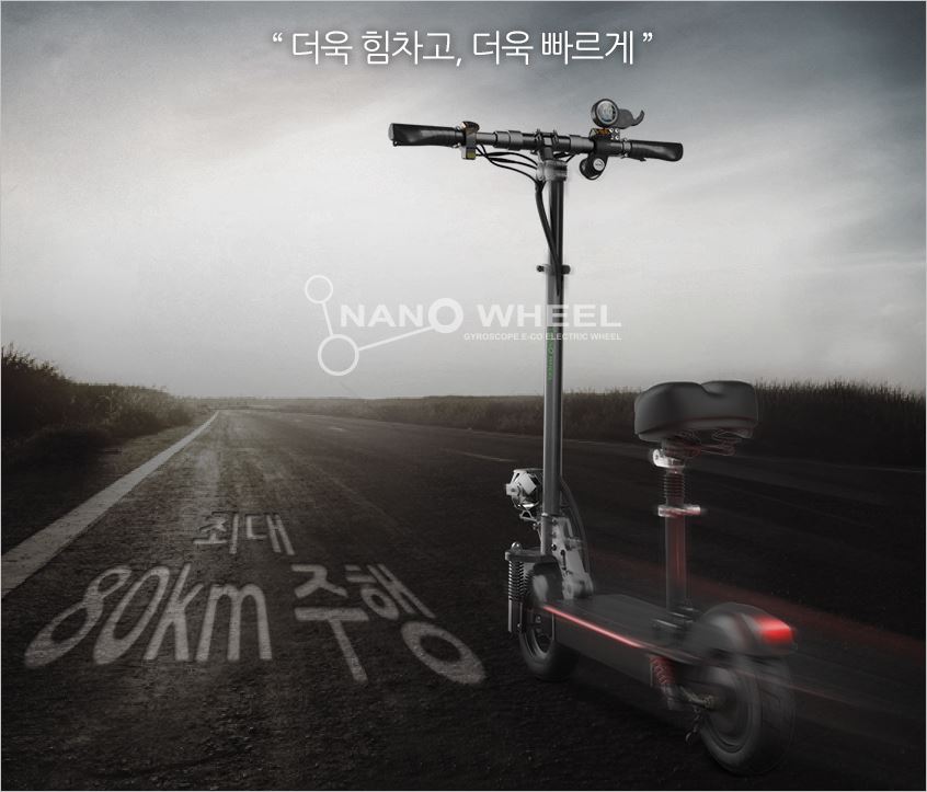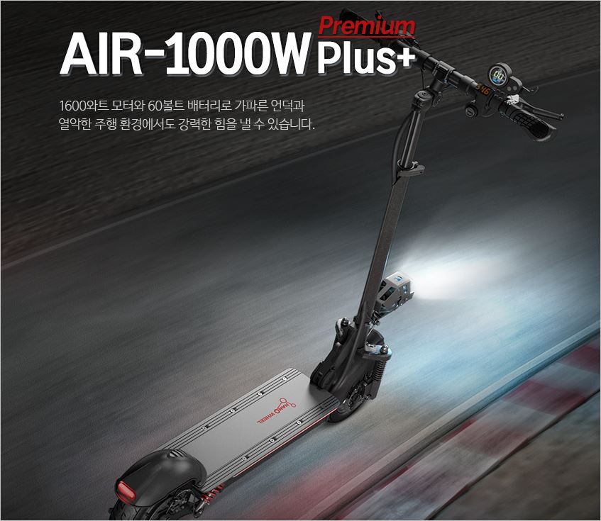 나노휠 AIR-1000W PLUS+는 60볼트의 배터리와 1600와트의 모터를 사용, 강력한 힘을 자랑하는 전동킥보드 입니다. 가파른 언덕과 비포장도로에서도 힘있는 주행을 할 수 있습니다.