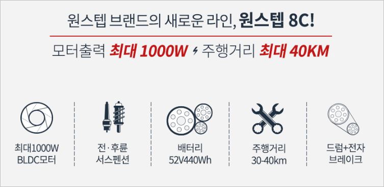 원스텝 8C는 최대 1000W BLDC모터를 장착, 빠른 속도와 최대 40km의 주행거리를 자랑하는 전동킥보드 입니다. 최대하중 100kg으로 중량은 16kg 입니다.