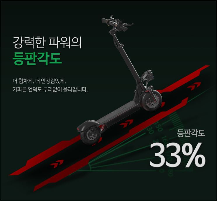 경사도 쉽게 오를 수 있는 힘 있는 350W 모터를 장착하였으며, 10인치 튜브리스 타이어로 충격 감소와 안정적인 주행을 자랑합니다.