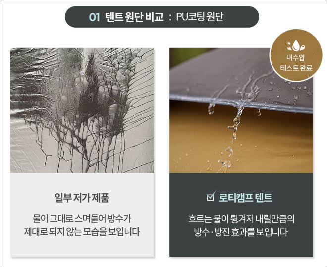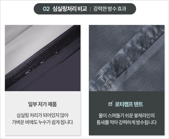 일반적으로 물이 잘 들어오는 봉제라인의 틈새를 심실링처리로 막아주어 완벽한 방수를 자랑합니다. 또한 화이버글라스 폴대를 이용해 흔들림없이 견고한 것도 장점입니다. 가격(4~5인용)은 84,900원 입니다. 캠핑 텐트 추천
