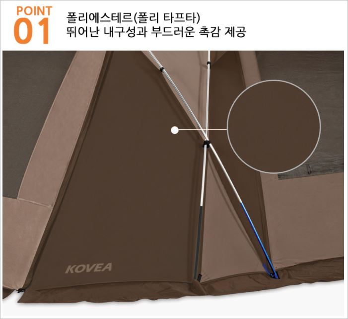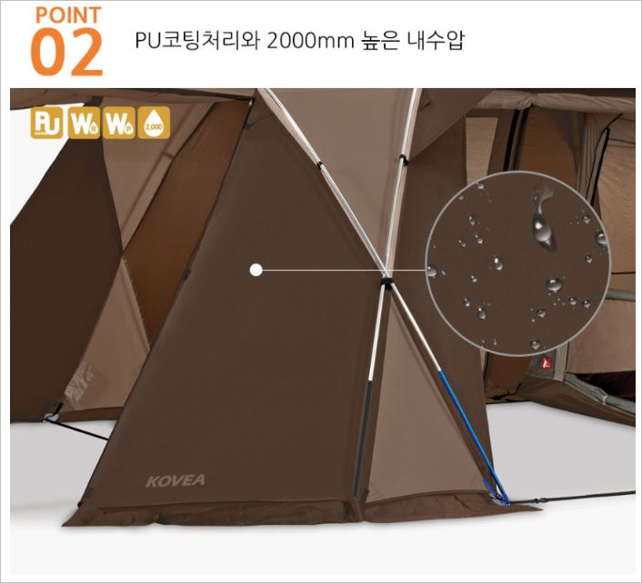 코베아 네스트2 텐트는 폴리에스테르를 사용하여 내구성은 물론, 부드러운 촉감까지 구현해냈습니다. 또한 PU코팅처리를 하여 2000m 높은 내수압을 자랑합니다.