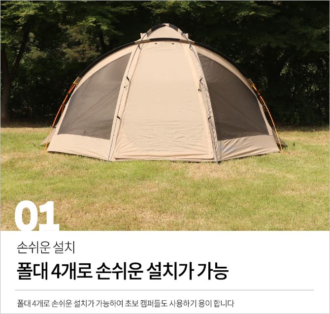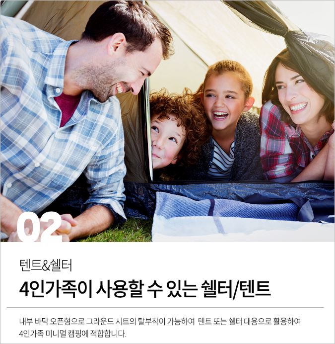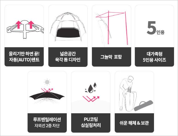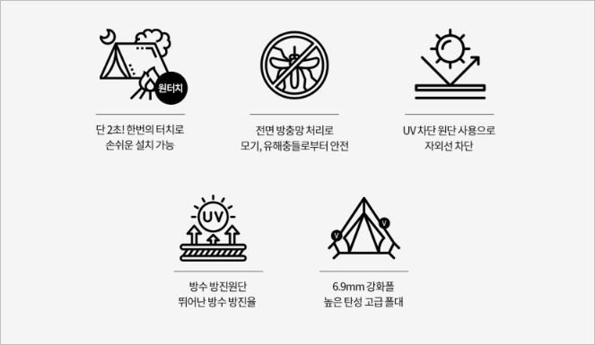 높은 탄성 고급 폴대를 사용했으며, 뛰어난 방수/방진을 자랑합니다. 단 2초만에 원터치로 설치가 가능하고, 유해충들로부터 안전한 것도 장점입니다. 가격(4~5인용)은 74,900원 입니다.