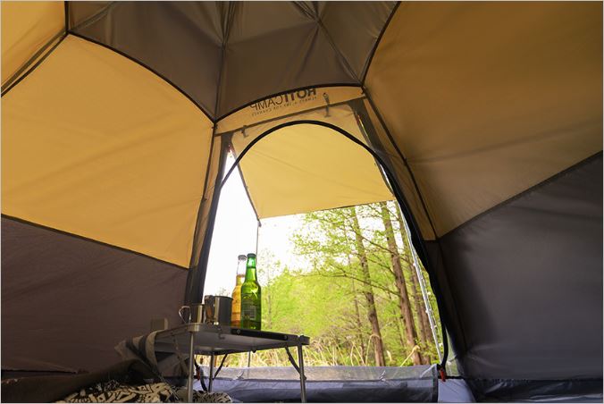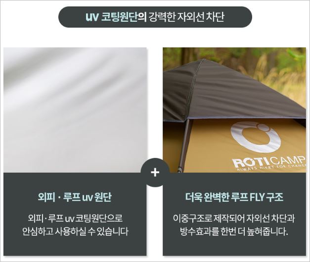 로티캠프 육각 원터치텐트는 '루프플라이' 구조를 이용하여 자외선 차단 및 방수효율을 극대화하였습니다. 이는 겨울에는 내부 보온성, 여름에는 바깥 열을 차단하여 텐트 내부를 보다 쾌적하게 해줍니다.