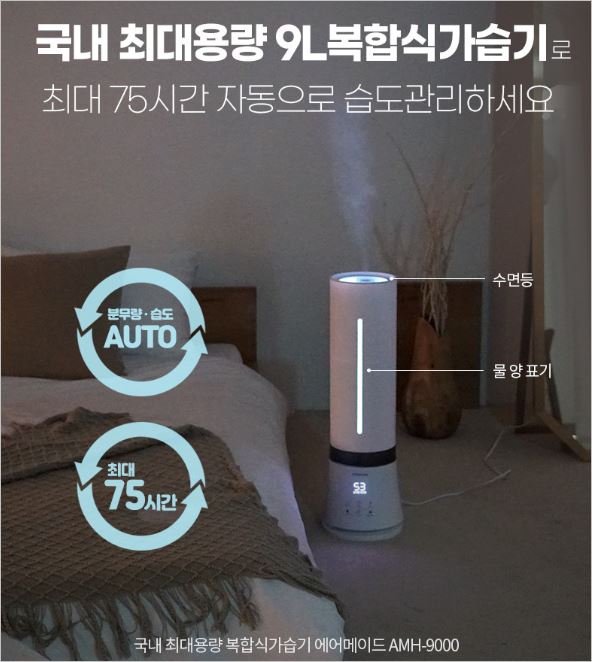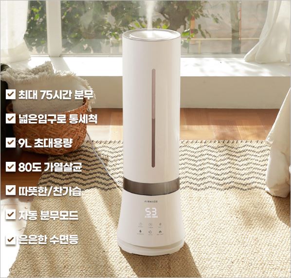 에어메이드 AMH-9000 대용량 가습기는 오픈마켓에서 판매율 1위에 빛나는 제품입니다. 9L 대용량 물통으로 최대 75시간 분무가 가능한 장점이 있습니다.