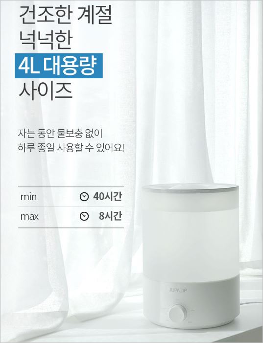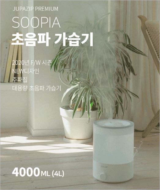 주파집 초음파가습기는 미세입자 초음파방식으로 가습을 하며, 4L 대용량 최대 40시간 사용이 가능한 제품입니다. 특히 소음이 매우 적어 예민한 분들에게 좋습니다.