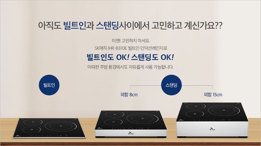 SK매직 IHR-B310E는 어떤 주방에서도 맞춤형으로 활용이 가능한 스마트형 인덕션입니다. 빌트인으로도 외함8cm 또는 외함 15cm의 스탠딩으로도 설치가 가능합니다.