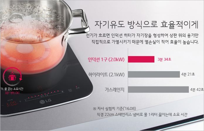 IH발열 기술을 탑재하였기 때문에 유해가스가 전혀 없고, 화재의 위험성도 크게 낮췄습니다. 이 기술이 탑재된 인덕션은 이미 유럽 및 미국의 가정에서 이미 70% 이상 사용할 만큼 검증되었다 할 수 있습니다.