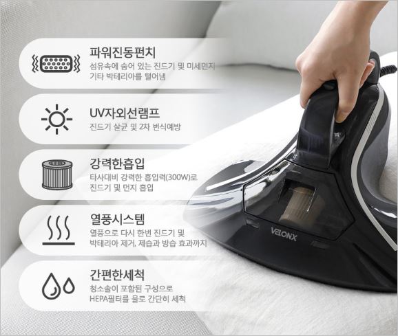 서흥인터내셔날 벨로닉스 SHVC-017은 이불진드기와 미세먼지를 완벽하게 없애주는 침구청소기 입니다. 벨로닉스만의 파워진동으로 진드기를 털어내고 300W의 강력한 흡입력으로 이를 빨아들이는 방식을 사용하고 있습니다.
