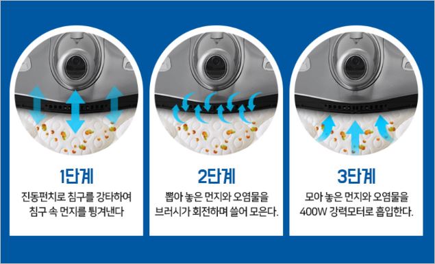 이 제품은 양쪽에서 흡입하여 훨씬 더 넓은 범위를 쉽게 빨아들일 수 있으며, 고급 롤러를 2개 장착해 침구가 달라붙지 않습니다. 가격은 298,000원 입니다. 침구청소기 추천