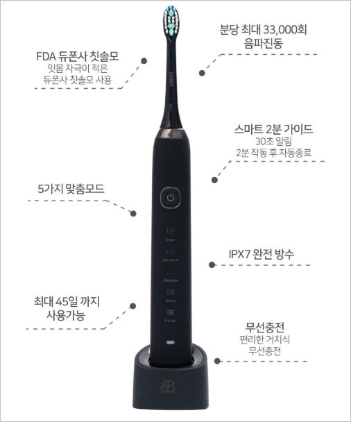총 5가지 맞춤 케어모드를 통해 미백, 광택, 착색제거, 세정 등이 가능하며, 충전 컵에 올려두는 것만으로도 자동 충전이 가능해 매우 편리한 제품입니다. 가격은 159,000원 입니다. 진동칫솔 추천