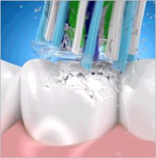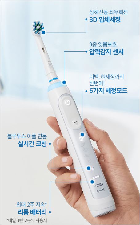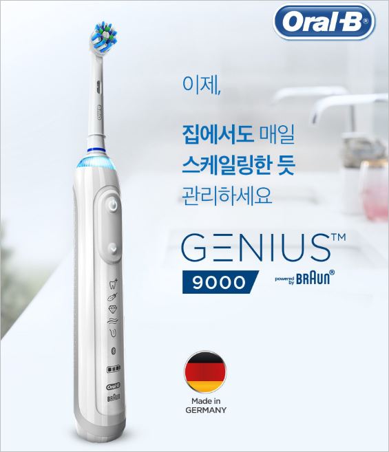 오랄비 지니어스 9000은 상하진동/좌우회전을 이용해 마치 집에서 스케일링을 받는 듣한 효과를 주는 제품입니다. 압력감지 센서를 탑재하여 잇몸을 보호하며 칫솔질을 해줍니다.