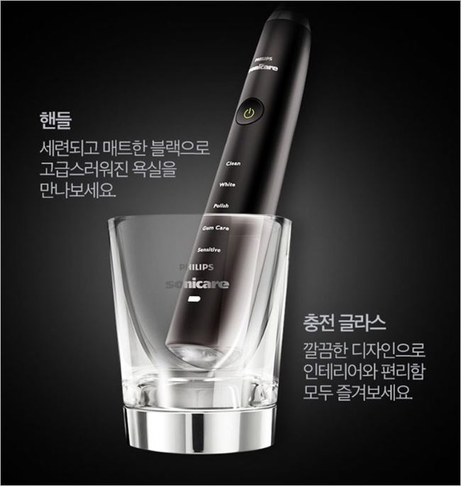 필립스 다이아몬드클린 HX9352는 진동칫솔 중에서도 TOP으로 꼽히는 프리미엄 제품입니다. 디자인적으로도 블랙의 고급미가 강조된 디자인으로 인테리어용으로도 좋습니다.