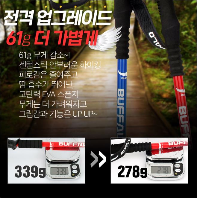 버팔로 하이킹 스틱 안티쇽은 278g 밖에 나가지 않는 초경량 등산스틱으로 피로감을 최대한 줄여준 제품입니다. 고탄력 스폰지를 장착하여 그립감과 땀 흡수에 효과적 입니다.