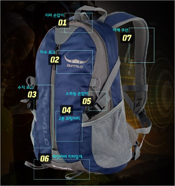 버팔로 BFL 등산배낭은 2중 코팅처리로 가방의 퀄리티를 높였으며, 어깨쿠션, 스트링손잡이, 레인커버 등 등산에 유용한 기능을 갖춘 제품입니다.